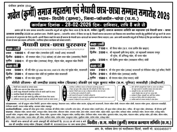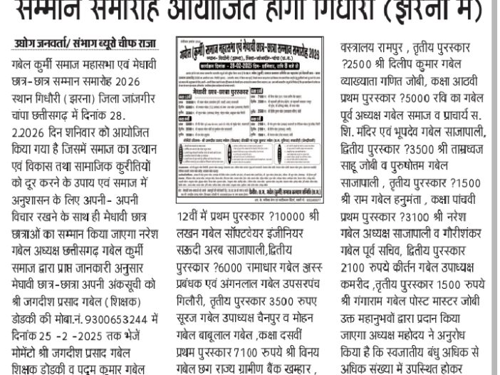 जिला जांजगीर चांपा के अंतर्गत आने वाले ग्राम गिधौरी (झरना) में गबेल कुर्मी समाज महासभा एवं मेधावी छात्र सम्मान समारोह 28फरवरी दिन शनिवार को आयोजित होगा