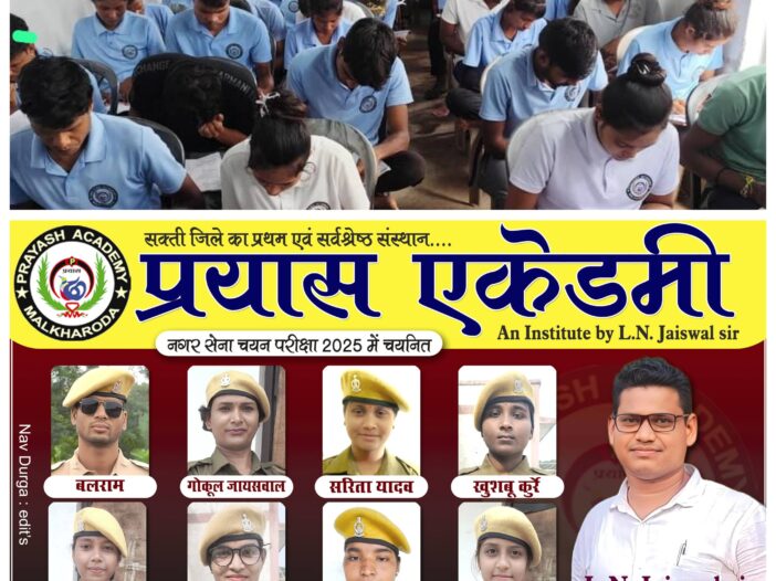 जिला सक्ती-छत्तीसगढ़ प्रदेश मिडिया प्रभारी राजा के साथ जिला रिपोर्टर श्रद्धा बर्मन की खास खबर। सक्ति जिला के प्रथम एवं सर्वश्रेष्ठ संस्था … [Read more...] about सक्ती-जिला के सर्वश्रेष्ठ संस्था प्रयास एकैडमी में नगर सेना चयन परिक्षा 2025 में 8 छात्राऐ चयनित हुआ,क्षेत्र में खुशी की लहर।