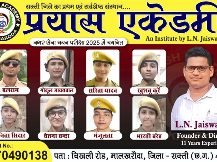 सक्ती-जिला के सर्वश्रेष्ठ संस्था प्रयास एकेडमी में नगर सेना चयन परिक्षा 2025 में 8 छात्राऐ चयनित हुआ,क्षेत्र में खुशी की लहर।