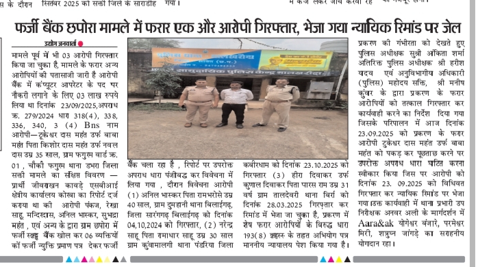 ब्लाक मालखरौदा के अंतर्गत आने वाले फर्जी बैंक छपोरा मामले में फरार एक और आरोपी गिरफ्तार, भेजा गया न्यायिक रिमांड पर जेल|