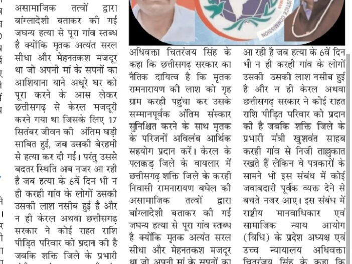 छत्तीसगढ़िया मजदूर राम की नृशंस हत्या से करही स्तब्ध सरकार मृतक के सम्मान जनक अंतिम संस्कार सुनिश्चित करे.. हाईकोर्ट अधिवक्ता.चितरंजय पटेल ने कहा