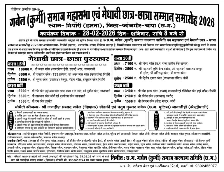जिला सक्ती-छत्तीसगढ़ प्रदेश मिडिया प्रभारी राजा के साथ ब्लाक रिपोर्टर उमेंद चौहान की खास खबर * गबेल कुर्मी समाज महासभा एवं मेधावी … [Read more...] about जिला जांजगीर-चांपा के अंतर्गत आने वाले ग्राम गिधौरी झरना में 28फरवरी दिन शनिवार को गबेल कुर्मी समाज महासभा एवं मेधावी छात्र सम्मान समारोह आयोजित होगा ।