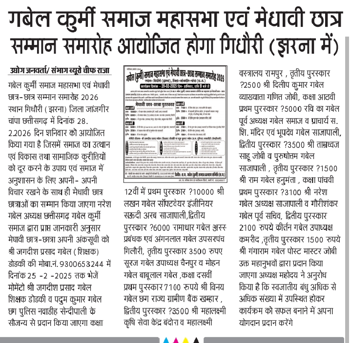 जिला जांजगीर चांपा के अंतर्गत आने वाले ग्राम गिधौरी (झरना) में गबेल कुर्मी समाज महासभा एवं मेधावी छात्र सम्मान समारोह 28फरवरी दिन शनिवार को आयोजित होगा