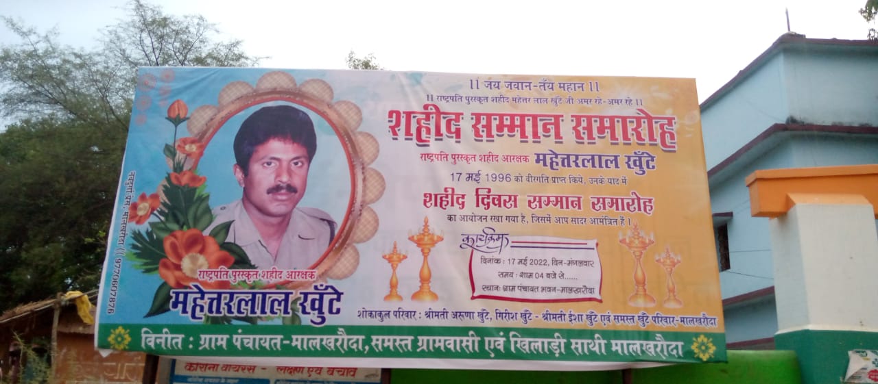 नवीन जिला सक्ती के अंतर्गत आने वाले ब्लाक मालखरौदा ग्राम पंचायत भवन में 17 मई 2022 को राष्ट्रपति पुरस्कृत शहिद आरक्षक महेत्तरलाल खुटे जी का पूण्यतिथि शहीद दिवस मनाया गया। इह कार्यक्रम के मुख्य अतिथि चंद्रपुर विधायक व राज्य मंत्री दर्जा मान.रामकुमार यादव जी रहे ।एवं अध्यक्षता किया मालखरौदा सरपंच एवं जिला सरपंच संघ अध्यक्ष श्री जितेन्द्र विजय बहादुर सिंह जी रहे ,विशिष्ट अतिथि जनपद अध्यक्ष लकेशवरी देवा लहरे रहे और इस शहीद के नाम को उजागर करने वाले प्रथम ब्यक्ति रमेश विशकर्मा पंच मालखरौदा से।