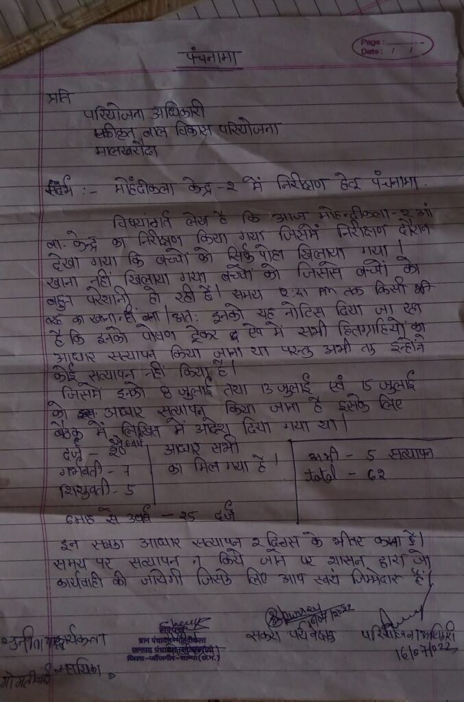 केंद्र 2 के लिए कोरा कागज में लिखा हे पंचनामा जिसमें सिर्फ 1 सरपंच ही सिल लगाया हे ,बाकि 4ब्यक्ति कहा है,और परियोजना अधिकारी एवं पर्यावेक्षक का सिल नहीं लगायी है ,नियम के तहत ये बिलकुल फर्जी है ,जब एक का सिल लगा है तो परियोजना व पर्यावेक्षकअधिकारी का भी सील होना चाहिए. बिच में नोटिस दिया जा रहा है लिखा गौर करे ,(ये नोटिस है की पंचनामा )