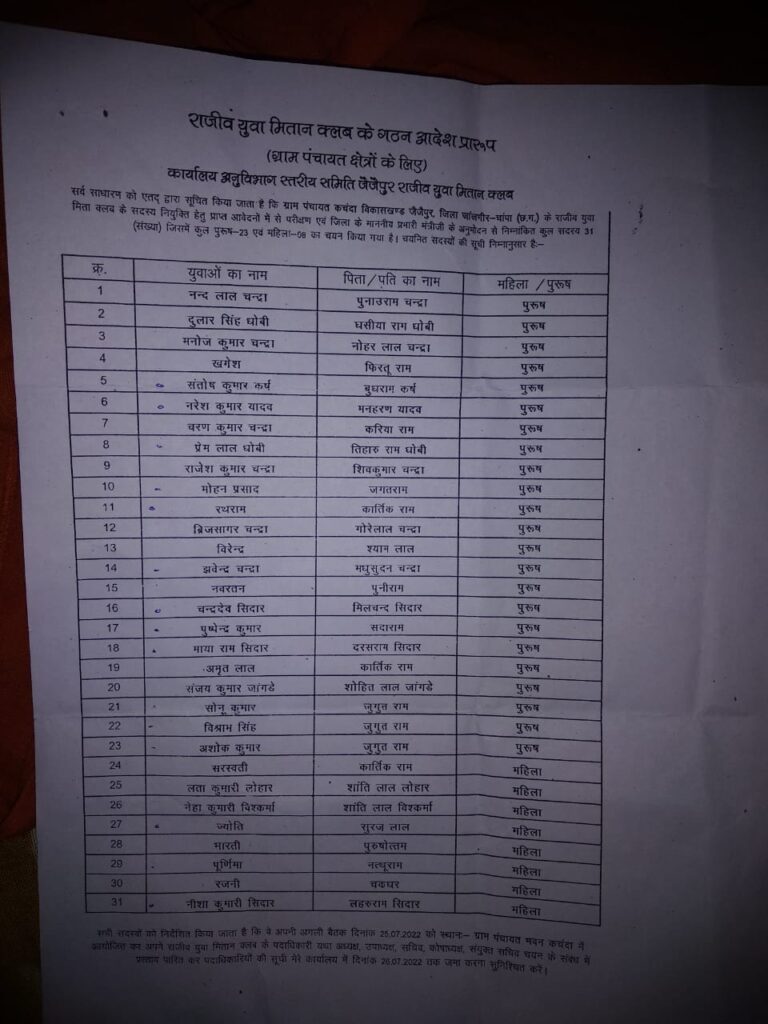 मान. प्रभारी मंत्री जी के अनुमोदन से कार्यालय अनुविभागीय स्तरीय समिति ब्लॉक जैजैपुर के द्वारा सूचित करने पर ग्राम कचंदा में सरपंच विमला पितर चौहान के मुख्य नेतृत्व में राजीव युवा मितान क्लब का गठन संपन्न हुआ पहले प्रभारी मंत्री का अनुमोदन से ग्राम कचंदा से 31 सदस्य चुना गया था इनमें से कुछ युवा लोग 19 अगस्त 2022 को ग्राम पंचायत कचंदा में बैठक में उपस्थित हुआ जिसमें पदाधिकारी चुना गया इस राजीव युवा कल्ब मितान के गठन का अध्यक्ष नरेश कुमार यादव,उपाध्यक्ष प्रेम लाल कर्ष ,,सचिव संतोष कमार कर्ष,, कोषाध्यक्ष मोहन प्रसाद चंद्रा,, संयुक्त सचिव निशा कुमारी सिदार एवं सदस्यगण मायाराम सिदार विश्राम सिंह सहिस, अशोक कुमार सहिस, सोनू कुमार सहिस , महेशराम चंद्रा ,ज्योति कुमारी विश्वकर्मा उपस्थित होकर बैठक को सफल बनाये ।