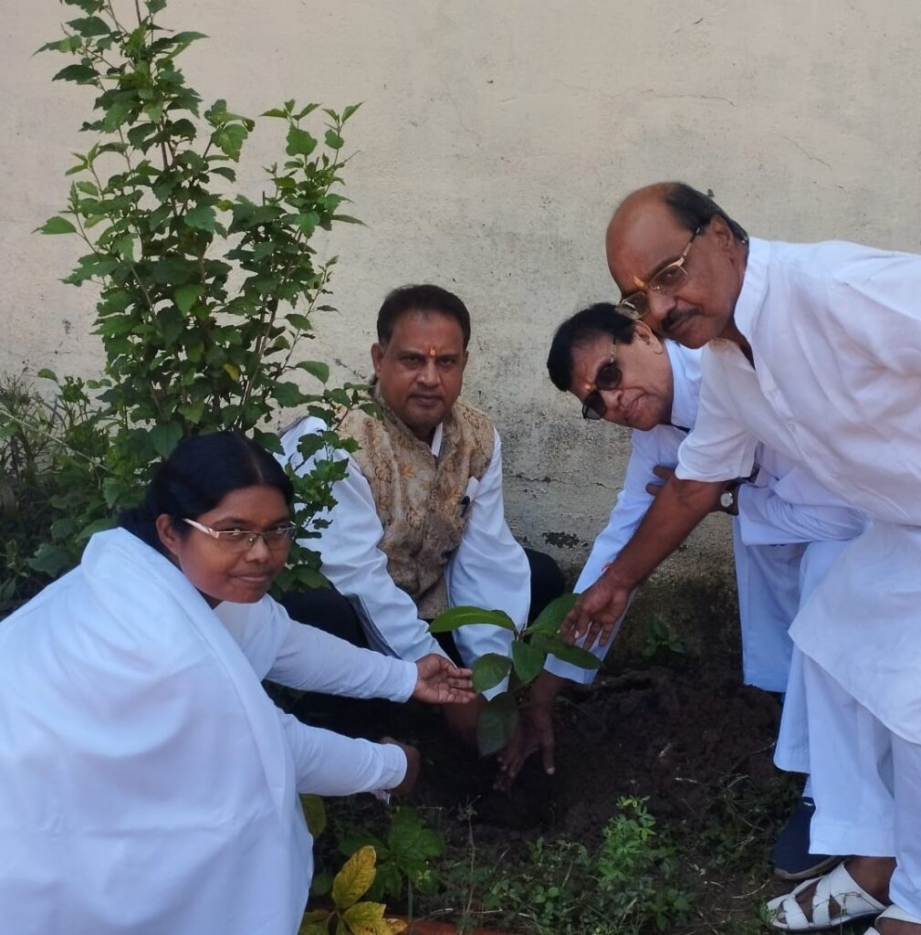 वृक्षारोपण करते हुए केंद्र की संचालिका बी के तुलसी बहेन ,अधिवक्ता चितरंजय सिहं पटेल एवं साथी गण ।