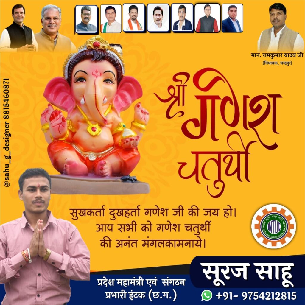 राष्ट्रीय मजदूर कांग्रेस के प्रदेश महामंत्री एवं संगठन प्रभारी सूरज साहू जी ने गणेश चतुर्थी की समस्त देशवासियों को दी बधाई