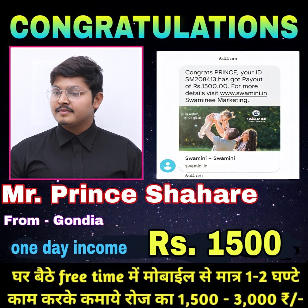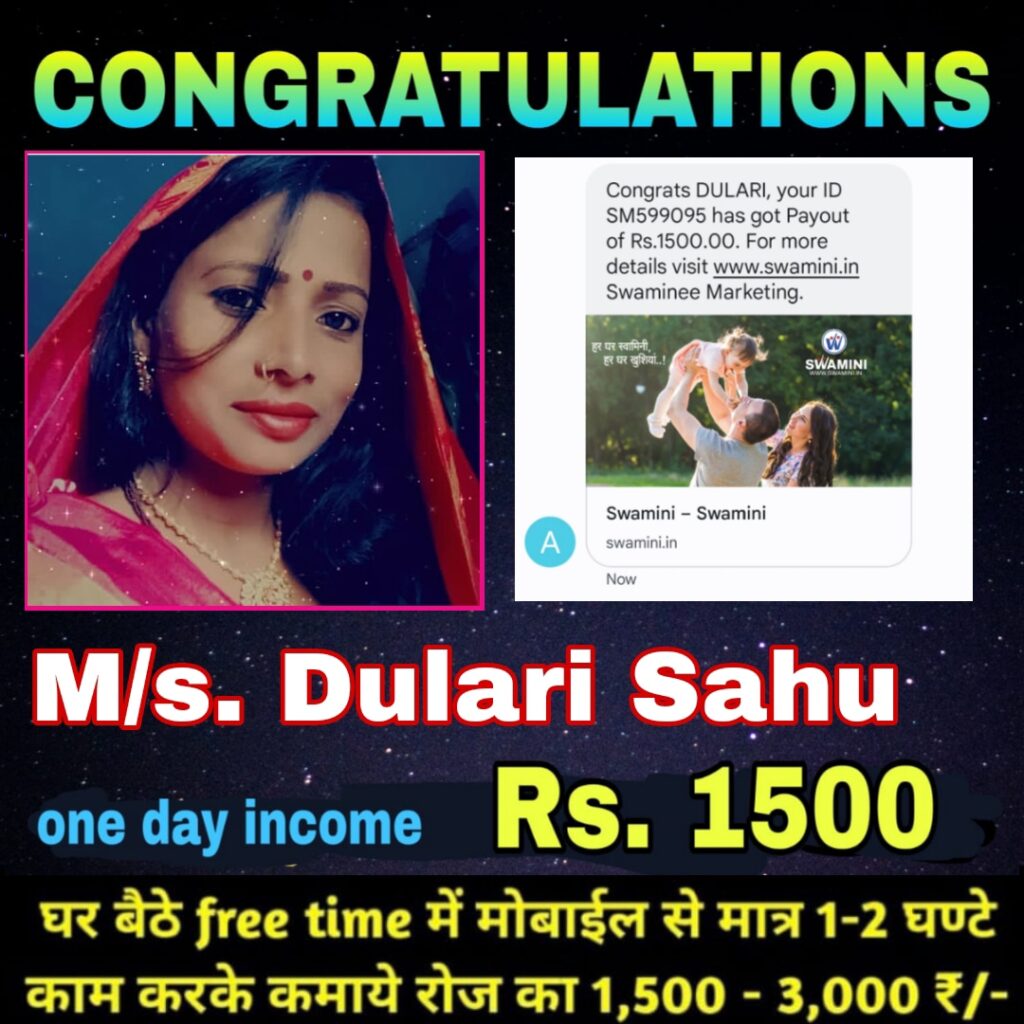 आपको बता दें कि आज की दुनिया डिजिटल कंप्यूटर युग का जमाना है हर कार्य ऑनलाइन किया जा रहा है आज की महंगाई को देखते हुए हर किसी को नौकरी पाना संभव नहीं है इसलिए भारत का नंबर वन स्वामिनी बिजनेस लाखों लोगों को रोजगार का अवसर दे रही है जहां आप घर बैठे ऑनलाइन काम करके हर रोज 1500 से 3000 तक एवं महीना में 40000 तक कमा सकते हो। आज इस बिजनेस में बड़े से बड़े व्यक्ति अमीर और गरीब ज्वाइन कर रहे हैं और अपना भविष्य सवार रहे है ,यह बहुत ही सरल और आसान है बस दो व्यक्ति को बोलना है और वह दो व्यक्ति और बोलते जाएगा प्रचार प्रसार करना है, ताकि आपके बेनिफिट अधिक से अधिक हो सके एक बार ही इसमें पैसे लगाना है सिर्फ 1700 रुपये बस एक बार जमा करना है ।पैसे,से पैसे कमाने का तरीका, 4आदमी को जोड़ने से आपके पैसा वापस हो जायेंगे।