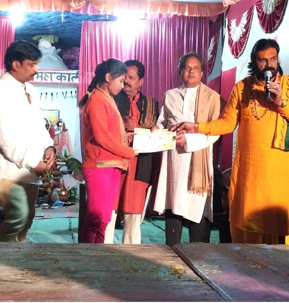 अंचल के प्रख्यात कथावाचक व भागवत प्रवाह अध्यात्मिक सेवा संस्थान छत्तीसगढ़ के संस्थापक अध्यक्ष राजेंद्र शर्मा के कुशल मार्गदर्शन में त्रिदिवसीय मां काली पूजन उत्सव के दरम्यान प्रथम दिवस कलश व थाली सजाओ प्रतियोगिता आयोजित की गई तो द्वितीय दिवस पर रंगोली प्रतियोगिता रखी गई तो वहीं अंतिम दिवस पर रंगारंग नृत्य प्रतियोगिता का आयोजन हुआ जिसमें गांव के ही 5 साल से 15 साल प्रतिभागी बच्चों ने अपने प्रतिभा का बेहतर प्रदर्शन किया जिससे अतिथियों के साथ ग्रामवासियों मोहित होकर झूमने को मजबूर थे तथा प्रदर्शन के साथ व्यक्तिगत इनामों की झड़ी लगा दी तो वहीं आयोजक महिला समिति की ओर से प्रथम स्थान प्राप्त प्रियंका पटेल, द्वितीय स्थान प्राप्त स्नेहा महंत व तृतीय स्थान प्राप्त संजना पटेल को नगद राशि पुरस्कार स्वरूप देकर सम्मानित किया गया । साथ ही भागवत प्रवाह अध्यात्मिक सेवा संस्थान छत्तीसगढ़ की ओर से आरती थाली सजाओ व रंगोली प्रतियोगिता के प्रथम द्वितीय तृतीय स्थान प्राप्त प्रतिभागियों को आचार्य राजेंद्र शर्मा, अधिवक्ता चितरंजय पटेल, दीनदयाल गबेल, रथराम पटेल व देवेंद्र सोनी के कर कमलों से पुरस्कृत व प्रशस्ति पत्र देकर सम्नानित किया गया।