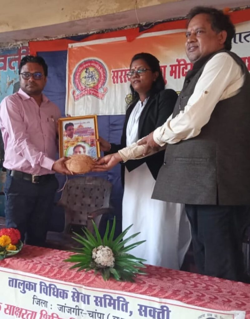 बिलसापुर उच्च न्यायालय के अधिवक्ता चितरंजय सिंह पटेल जी ने जिला सक्ती न्यायालय के व्यवहार न्यायाधीश चेतना सिंह जी एवं जिला चिकित्सा अधिकारी डाँ.सुरज राठौर जी को स्मृति चिन्ह देकर सम्मानित किया।