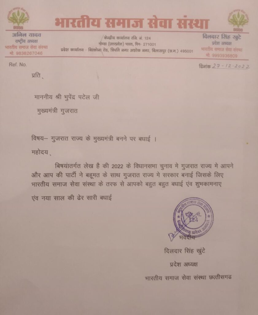 भारतीय समाज सेवा संस्था के छत्तीसगढ़ प्रदेश अध्यक्ष श्री दिलदार सिंह खुटे जी ने गुजरात के मुख्यमंत्री को बधाई संदेश लिखा उन्होंने कहा कि दिसंबर 2022 के विधानसभा चुनाव में उन्होंने और उसकी पार्टी ने बहुत मेहनत की जिसके कारण वहां सरकार बनाने में कामयाब रहा वही भारतीय समाज सेवा संस्था के प्रदेश अध्यक्ष ने कहा कि आप गुजरात राज्य को संविधान के दायरे में रहकर विकास करेंगे यही अपेक्षा आपसे हम रखते हैं वही हिमाचल प्रदेश के भूपेन्द्र पटेल जी को मुख्यमंत्री बनने पर बधाई पत्र एवं साथी ही साथ नए साल की ढेर सारी बधाई एवं शुभकामनाएं संदेश भेजा