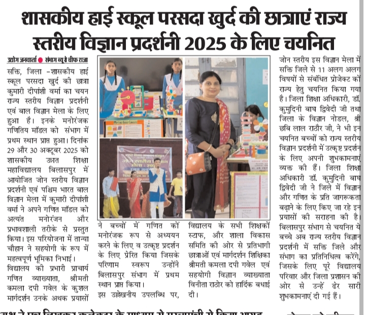 सक्ति, जिला -शासकीय हाई स्कूल परसदा खुर्द की छात्रा कुमारी दीपांशी वर्मा का चयन राज्य स्तरीय विज्ञान प्रदर्शनी एवं बाल विज्ञान मेला के लिए हुआ है। इनके मनोरंजक गणितिय मॉडल को संभाग में प्रथम स्थान प्राप्त हुआ।