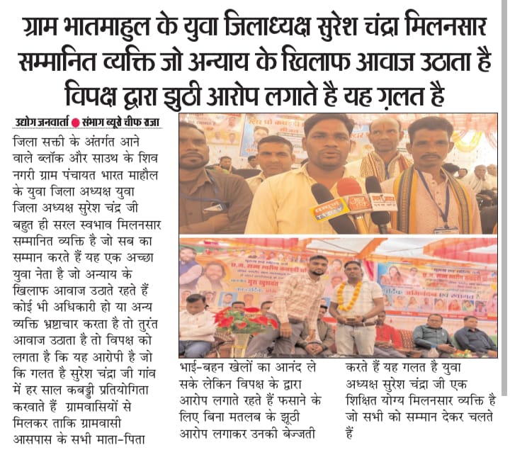 जिला सक्ती के अंतर्गत आने वाले ब्लॉक और साउथ के शिव नगरी ग्राम पंचायत भारत माहौल के युवा जिला अध्यक्ष युवा जिला अध्यक्ष सुरेश चंद्र जी बहुत ही सरल स्वभाव मिलनसार सम्मानित व्यक्ति है जो सब का सम्मान करते हैं यह एक अच्छा युवा नेता है जो अन्याय के खिलाफ आवाज उठाते रहते हैं कोई भी अधिकारी हो या अन्य व्यक्ति भ्रष्टाचार करता है तो तुरंत आवाज उठाता है तो विपक्ष को लगता है कि यह आरोपी है जो कि गलत है सुरेश चंद्रा जी गांव में हर साल कबड्डी प्रतियोगिता करवाते हैं ग्रामवासियों से मिलकर ताकि ग्रामवासी आसपास के सभी माता-पिता भाई-बहन खेलों का आनंद ले सके लेकिन विपक्ष के द्वारा आरोप लगाते रहते हैं फसाने के लिए बिना मतलब के झूठी आरोप लगाकर उनकी बेज्जती करते हैं यह गलत है युवा अध्यक्ष सुरेश चंद्रा जी एक शिक्षित योग्य मिलनसार व्यक्ति है जो सभी को सम्मान देकर चलते हैं