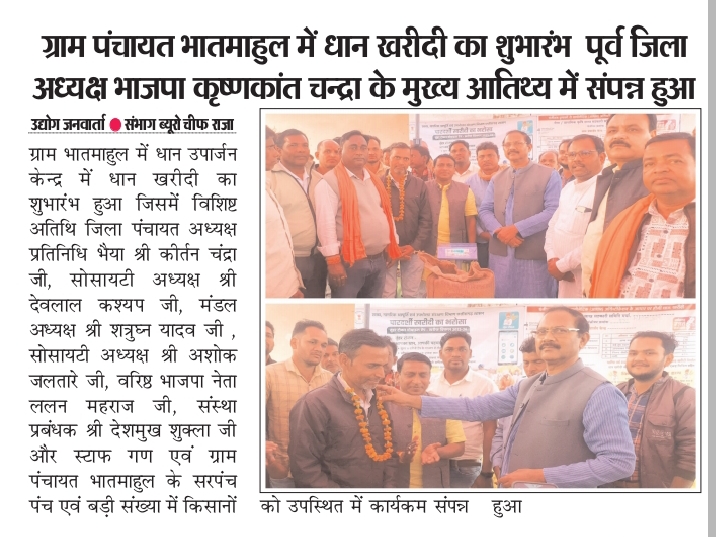 ग्राम भातमाहुल में धान उपार्जन केन्द्र में धान खरीदी का शुभारंभ हुआ जिसमें विशिष्ट अतिथि जिला पंचायत अध्यक्ष प्रतिनिधि भैया श्री कीर्तन चंद्रा जी, सोसायटी अध्यक्ष श्री देवलाल कश्यप जी, मंडल अध्यक्ष श्री शत्रुघ्न यादव जी चंद्रा समाज के युवा जिलाध्यक्ष सुरेश चंद्रा जी, सोसायटी अध्यक्ष श्री अशोक जलतारे जी, वरिष्ठ भाजपा नेता ललन महराज जी, संस्था प्रबंधक श्री देशमुख शुक्ला जी और स्टाफ गण एवं ग्राम पंचायत भातमाहुल के सरपंच पंच एवं बड़ी संख्या में किसानों को उपस्थित में कार्यकम संपन्न हुआ मोदी सरकार की कार्य को तेजी से प्रगति हो रहा है सबका साथ सबका विकास सबका प्रयास से ।