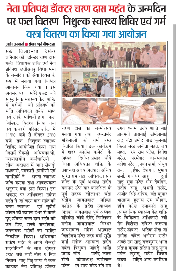 सक्ती जिला)-13 दिसंबर शनिवार को डॉक्टर चरण दास महंत विधायक शक्ति एवं नेता प्रतिपक्ष छत्तीसगढ़ विधानसभा के जन्मदिन को सेवा दिवस के रूप में मनाया गया विभिन्न आयोजन किया गया । इस अवसर पर सवेरे 9:30 बजे सामुदायिक स्वास्थ्य केंद्र शक्ति में मरीजों को प्रतिवर्ष की भांति अधिवक्ता राकेश महंत एवं उनके साथियों द्वारा फल बिस्किट वितरण किया गया एवं कचहरी परिसर शक्ति में 11:00 बजे से दोपहर 3:00 बजे तक निशुल्क स्वास्थ्य शिविर आयोजित किया गया जिसमें सैकड़ो अधिवक्ताओ, न्यायालयीन कर्मचारियो , लोक अदालत में आए सैकड़ो पक्षकारो, पत्रकारों ,ग्रामीणो एवं नागरिकों ने अपना स्वास्थ्य जांच कराया तथा आवश्यकता अनुसार दवा प्राप्त किया