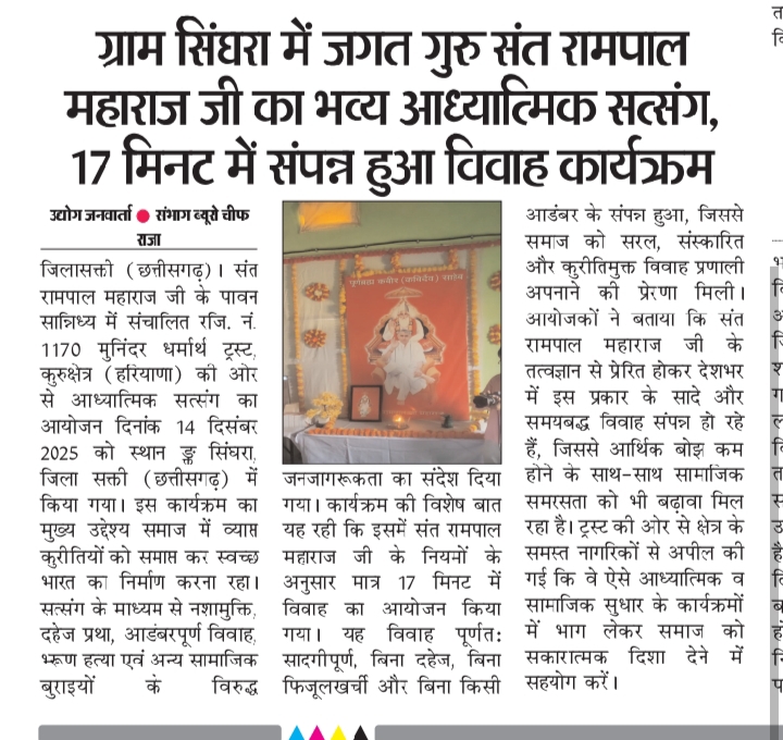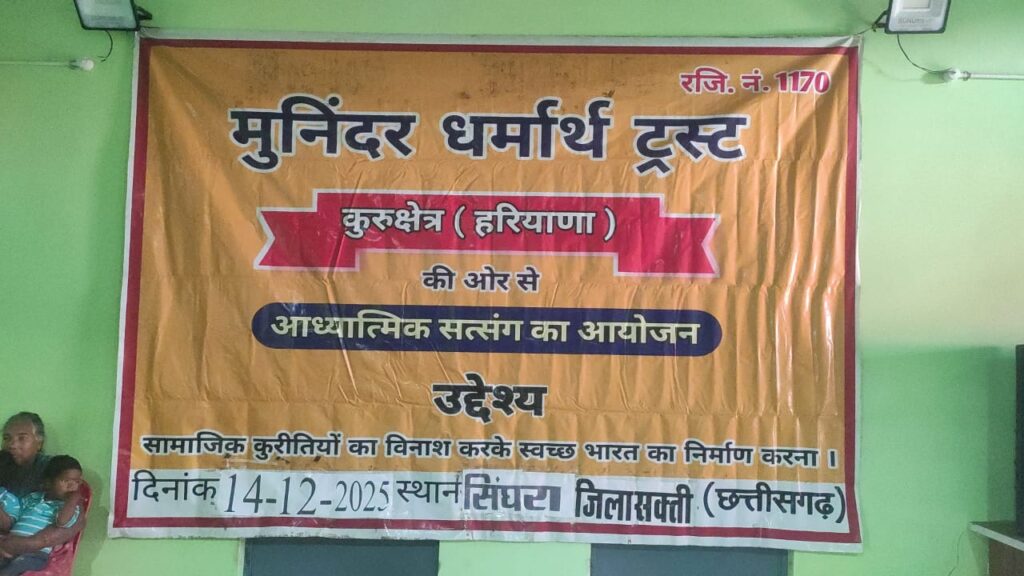 संत रामपाल महाराज जी के पावन सान्निध्य में संचालित रजि. नं. 1170 मुनिंदर धर्मार्थ ट्रस्ट, कुरुक्षेत्र (हरियाणा) की ओर से आध्यात्मिक सत्संग का आयोजन दिनांक 14 दिसंबर 2025 को स्थान – सिंघरा, जिला सक्ती (छत्तीसगढ़) में किया गया।
