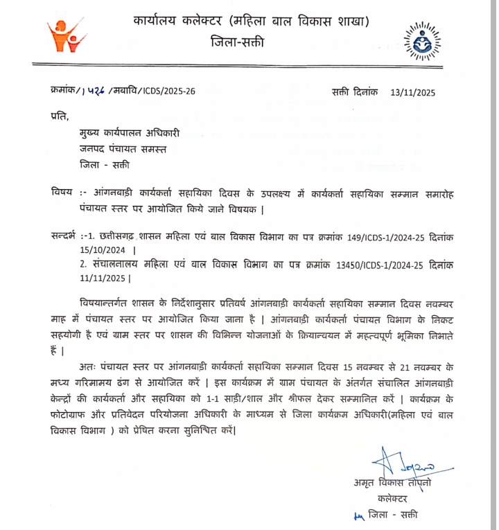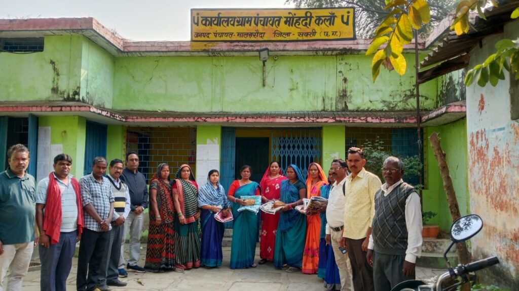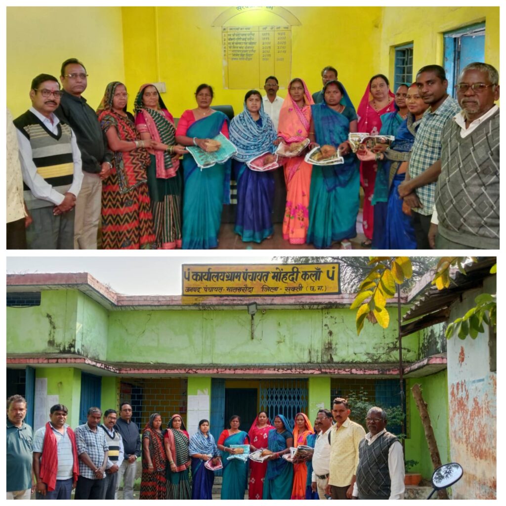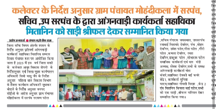 जिला सक्ति विषय अंतर्गत शासन के निर्देश अनुसार प्रतिवर्ष आंगनवाड़ी कार्यकर्ता सहायिका मितानिन सम्मान दिवस पंचायत स्तर पर आयोजित किया जाता है 2025 में इस वर्ष जिला सक्ती के कलेक्टर अमृत विकास तोपनो के निर्देशानुसार एवं जिला मुख्य कार्यपालन अधिकारी सिवो वासु जैन के निर्देश अनुसार महिला बाल विकास विभाग के जिला कार्यक्रम अधिकारी सुधाकर बोदले के निर्देश अनुसार जनपद सीईओ के आदेश अनुसार ग्राम पंचायत मोंहदीकला में सरपंच नरायण पटेल ,सचिव गंगाराम जयसवाल, उपसरपंच रमाबाई मिताचंद देवांगन, पंच ,मोहन देवांगन, उमेश पटेल,गीता पटेल ,गौरी पटेल ,कमला देवांगन, रमता देवांगन,डाकुवर पटेल ,सोभाराम पटेल समाजिक कार्यकर्ता एवं धान मंडी अध्यक्ष, सेवक देवांगन,सभी के समक्ष आंगनबाड़ी कार्यकर्ता चेता बंजारे,सहायिका देवकी बाई कवंर केंद्र1, कार्यकर्ता सुनिता यादव,सहायिका गोमती सिदार ,केद्र 2 एंव मितानिन बिमला बाई पटेल,सभी को एक साड़ी ,श्रीफल नारियल देकर सम्मानित किया गया।