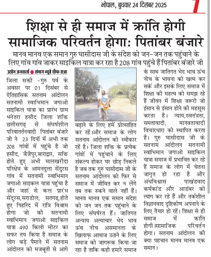 जिला सक्ती -गुरु पर्व के अवसर पर 01 दिसंबर से ऐतिहासिक सतनाम आंदोलन सतनामी स्वाभिमान जगाओ साइकिल यात्रा का प्रारंभ ग्राम भनेतरा हसौद जिला शक्ति छत्तीसगढ़ से संघर्षशील परिवातर्तनवादी पितांबर बंजारे जी ने 23 दिनों में अभी तक 208 गांवों में पहुंचे है जो हसौद, जैजैपुर,बाराद्वार, सक्ति होते हुए अभी मालखरौदा परिक्षेत्र के आमनदुला सेंदुरस गांव में सतनामी स्वाभिमान जगाओ साइकल यात्रा पहुंचा है और जहां से कल प्रारंभ सेंदुरस,सराडोल, सतगढ़,होते हुए पिहरिद में रात्रि विश्राम होगा जो की सतनामी स्वाभिमान जगाओ साइकिल यात्रा 490 किलो मीटर का सफर तय किया है समाज के लोग बड़े पैमाने में सतनाम आंदोलन को मजबूती से आगे बढ़ाने के लिए हमें प्रोत्साहित कर रहें।और समाज के लोग सतनाम आंदोलन को स्वीकार रहें है।