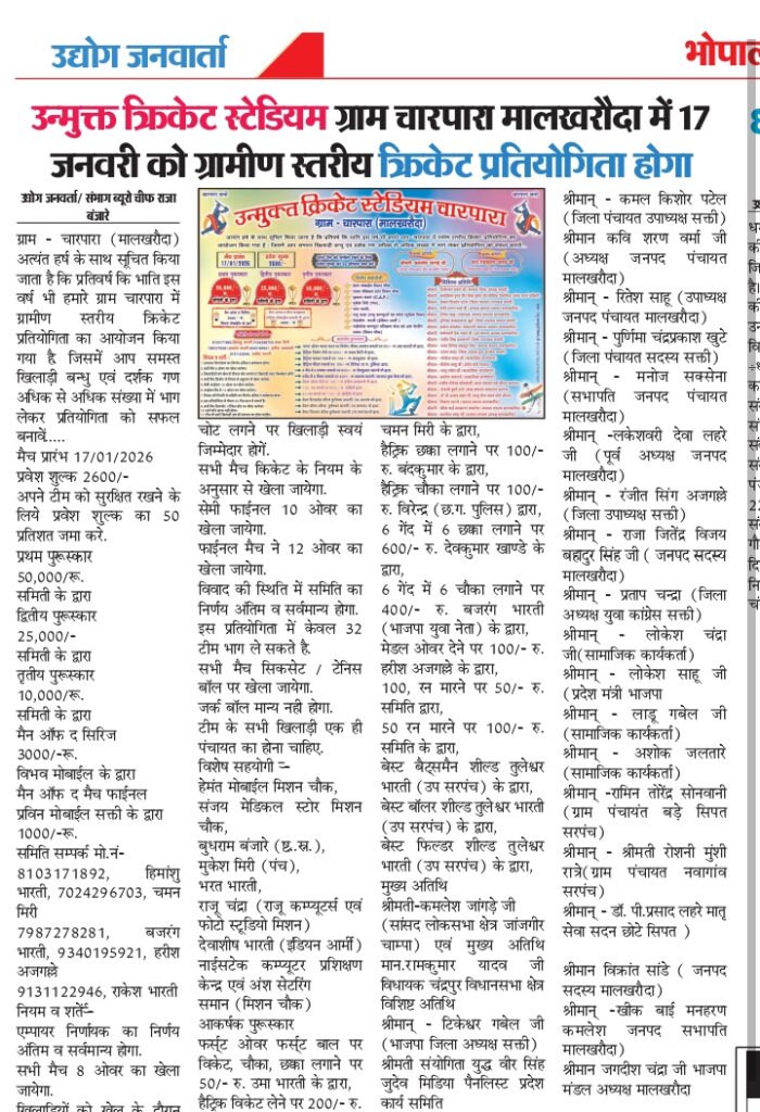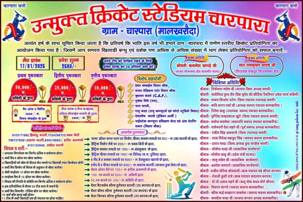 अत्यंत हर्ष के साथ सूचित किया जाता है कि प्रतिवर्ष कि भाति इस वर्ष भी हमारे ग्राम चारपारा में ग्रामीण स्तरीय क्रिकेट प्रतियोगिता का आयोजन किया गया है. जिसमें आप समस्त खिलाड़ी बन्धु एवं दर्शक गण अधिक से अधिक संख्या में भाग लेकर प्रतियोगिता को सफल बनावें…..