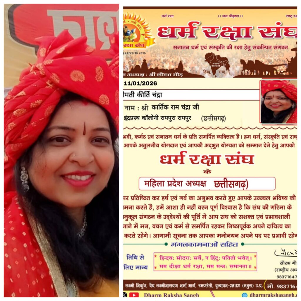 धर्म रक्षा संघ के प्रदेश अध्यक्ष कीर्ति चंद्रा जी को बनाया गया जिससे क्षेत्र में खुशी की लहर है। इस अवसर पर समर्थकों ने कीर्ति चंद्रा को बधाई दी और उनके नेतृत्व में संगठन के विस्तार की उम्मीद जताई ¹।