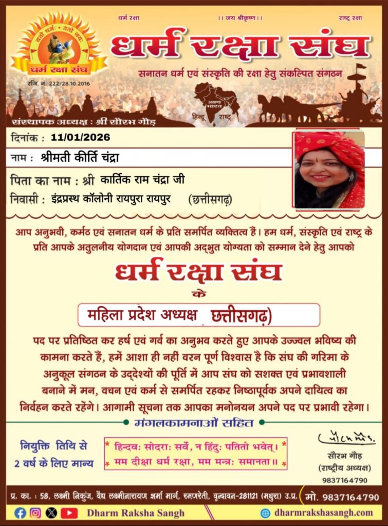 “धर्म रक्षा संघ” नामक संगठन का एक नियुक्ति पत्र है. यह संगठन सनातन धर्म और संस्कृति की रक्षा के लिए संकल्पित है.