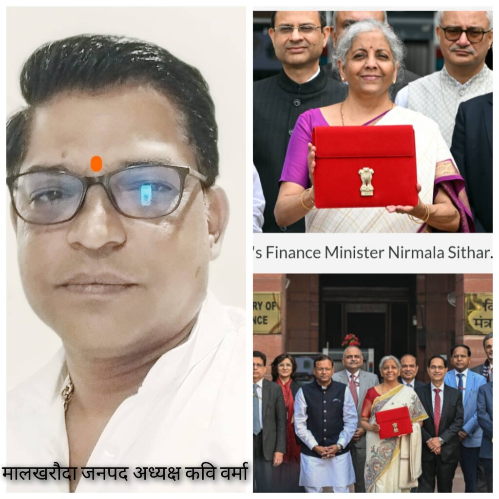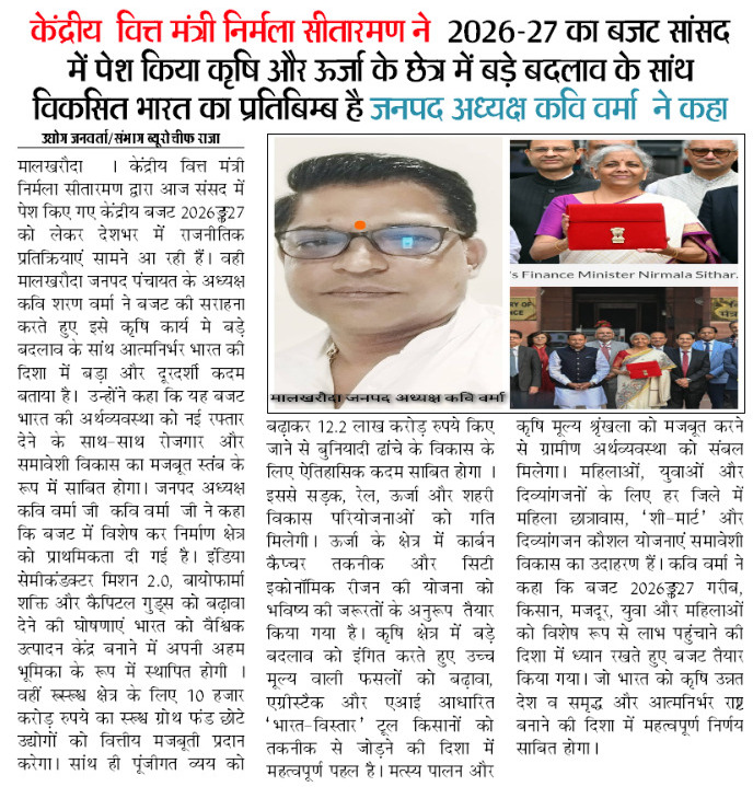 मालखरौदा । केंद्रीय वित्त मंत्री निर्मला सीतारमण द्वारा आज संसद में पेश किए गए केंद्रीय बजट 2026–27 को लेकर देशभर में राजनीतिक प्रतिक्रियाएं सामने आ रही हैं। वही मालखरौदा जनपद पंचायत के अध्यक्ष कवि शरण वर्मा ने बजट की सराहना करते हुए इसे कृषि कार्य मे बड़े बदलाव के सांथ आत्मनिर्भर भारत की दिशा में बड़ा और दूरदर्शी कदम बताया है।