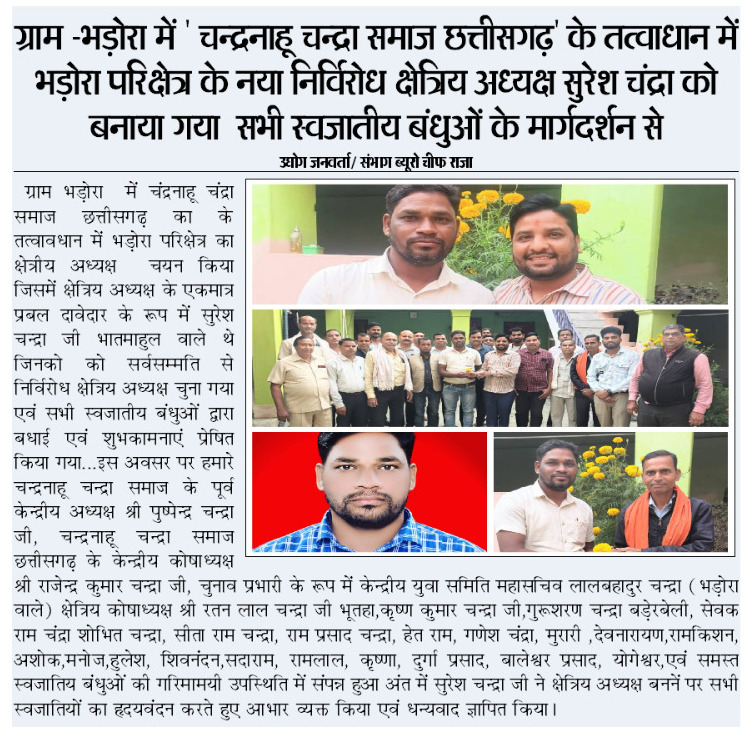 ग्राम भड़ोरा में चंद्रनाहू चंद्रा समाज छत्तीसगढ़ का के तत्वावधान में भड़ोरा परिक्षेत्र का क्षेत्रीय अध्यक्ष चयन किया जिसमें क्षेत्रिय अध्यक्ष के एकमात्र प्रबल दावेदार के रूप में सुरेश चन्द्रा जी भातमाहुल वाले थे जिनको को सर्वसम्मति से निर्विरोध क्षेत्रिय अध्यक्ष चुना गया एवं सभी स्वजातीय बंधुओं द्वारा बधाई एवं शुभकामनाएं प्रेषित किया गया…इस अवसर पर हमारे चन्द्रनाहू चन्द्रा समाज के पूर्व केन्द्रीय अध्यक्ष श्री पुष्पेन्द्र चन्द्रा जी, चन्द्रनाहू चन्द्रा समाज छत्तीसगढ़ के केन्द्रीय कोषाध्यक्ष श्री राजेन्द्र कुमार चन्द्रा जी, चुनाव प्रभारी के रूप में केन्द्रीय युवा समिति महासचिव लालबहादुर चन्द्रा (भड़ोरा वाले) क्षेत्रिय कोषाध्यक्ष श्री रतन लाल चन्द्रा जी भूतहा,कृष्ण कुमार चन्द्रा जी,गुरूशरण चन्द्रा बड़ेरबेली, सेवक राम चंद्रा शोभित चन्द्रा, सीता राम चन्द्रा, राम प्रसाद चन्द्रा, हेत राम, गणेश चंद्रा, मुरारी ,देवनारायण,रामकिशन, अशोक,मनोज,हुलेश, शिवनंदन,सदाराम, रामलाल, कृष्णा, दुर्गा प्रसाद, बालेश्वर प्रसाद, योगेश्वर,एवं समस्त स्वजातिय बंधुओं की गरिमामयी उपस्थिति में संपन्न हुआ अंत में सुरेश चन्द्रा जी ने क्षेत्रिय अध्यक्ष बननें पर सभी स्वजातियों का हृदयवंदन करते हुए आभार व्यक्त किया एवं धन्यवाद ज्ञापित किया ..🌷🙏