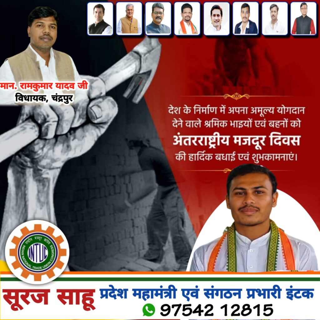 राष्ट्रीय मजबूर कांग्रेस इंटक के प्रदेश महामंत्री एवं संगठन प्रभारी सूरज साहू ने अंतर्राष्ट्रीय मजदूर दिवस की हार्दिक बधाई एवं शुभकामनाएं दिया ।