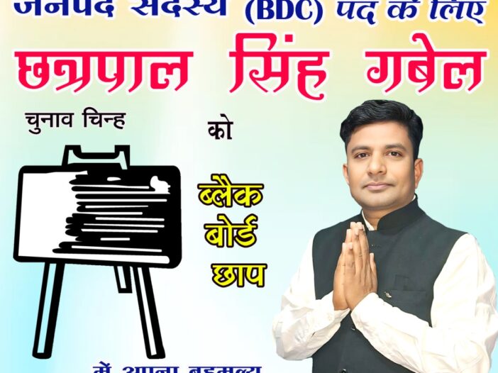 जनपद पंचायत मालखरौदा क्षेत्र क्रा.7 ग्राम मालखरौदा एवं कलमी से शिक्षित मिलनसार ईमानदार योग्य बी डी सी प्रत्याशी क्षत्रपाल ने विनम्र विनती किया जनताओ से अपने चुनाव चिन्ह ब्लेक बोल्ड छाप में भारी मतों से विजयी बनावे ताकि क्षेत्र की विकास कारा सके।