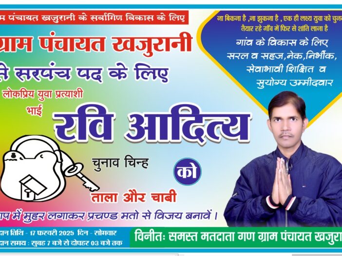 ग्राम पंचायत खजुरानी से शिक्षित मिलनसार योग्य सरपंच प्रत्याशी रवि आदित्य को ताला चाबी छाप में बोट देखकर विजयी बनावे, ग्राम वासियों का आशीर्वाद भरपूर समर्थन मिल रहा है।