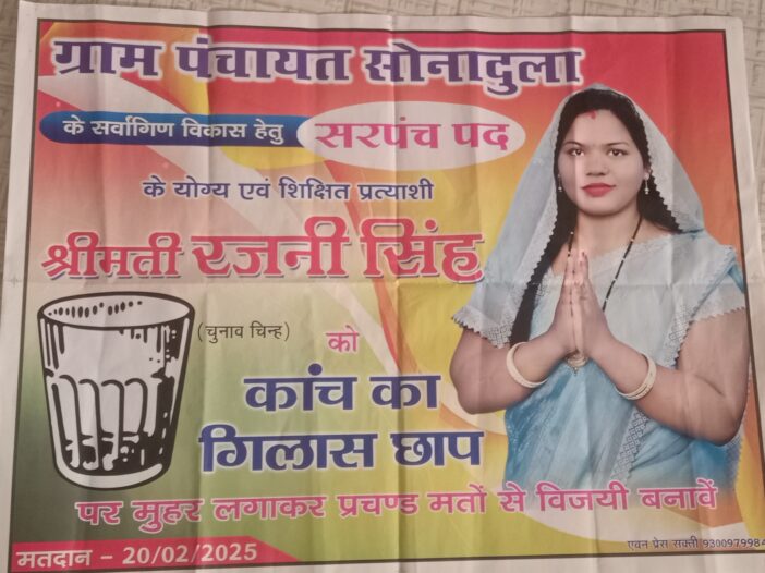ब्लाक मालखरौदा के ग्राम पंचायत सोनादुला के योग्य मिलनसार ईमानदार शिक्षित सरपंच प्रत्याशी रजनी सिंह सबसे आगे ग्रामवासीयो का भारी आशिर्वाद मिल रहा है,