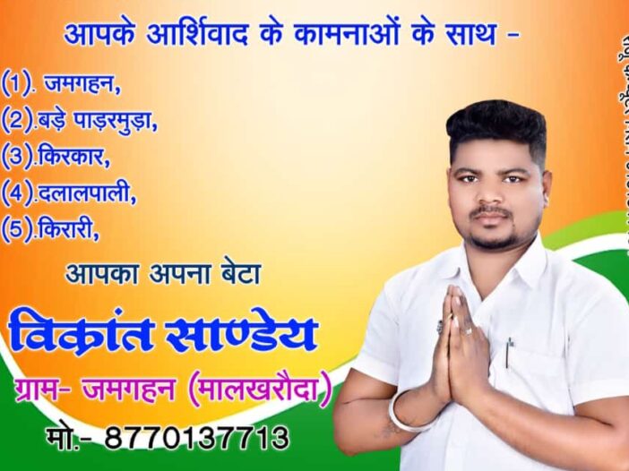 जिला सक्ती-छत्तीसगढ़ प्रदेश मिडिया प्रभारी राजा बंजारे के साथ जिला कैमरामैन रामकिशन चंद्रा, शिवा यादव के साथ जिला रिपोर्टर उषा रात्रे,श्रद्धा … [Read more...] about जिला सक्ती के अंतर्गत आने वाले जनपद पंचायत मालखरौदा के ग्राम जमगहन से बी डी सी प्रत्याशी विक्रांत साण्डेय ने जोरदार रैली के साथ तहसील आकर नामांकन फार्म भरा।