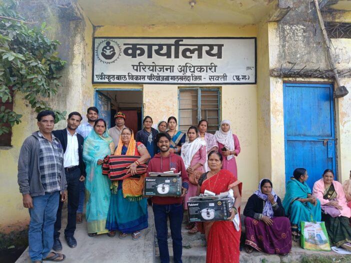 महिला बाल विकास विभाग के सभापति खीकबाई मनहरण ने मालखरौदा परियोजना कार्यालय में आंगनबाड़ी कार्यकर्ताओं को सामग्री सम्मान विचरण किया