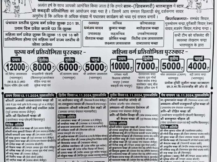 ब्लाक जैजैपुर के ग्राम भातमाहुल में चार दिवसीय कबड्डी प्रतियोगिता 13 नवंबर से होगा प्रारंभ